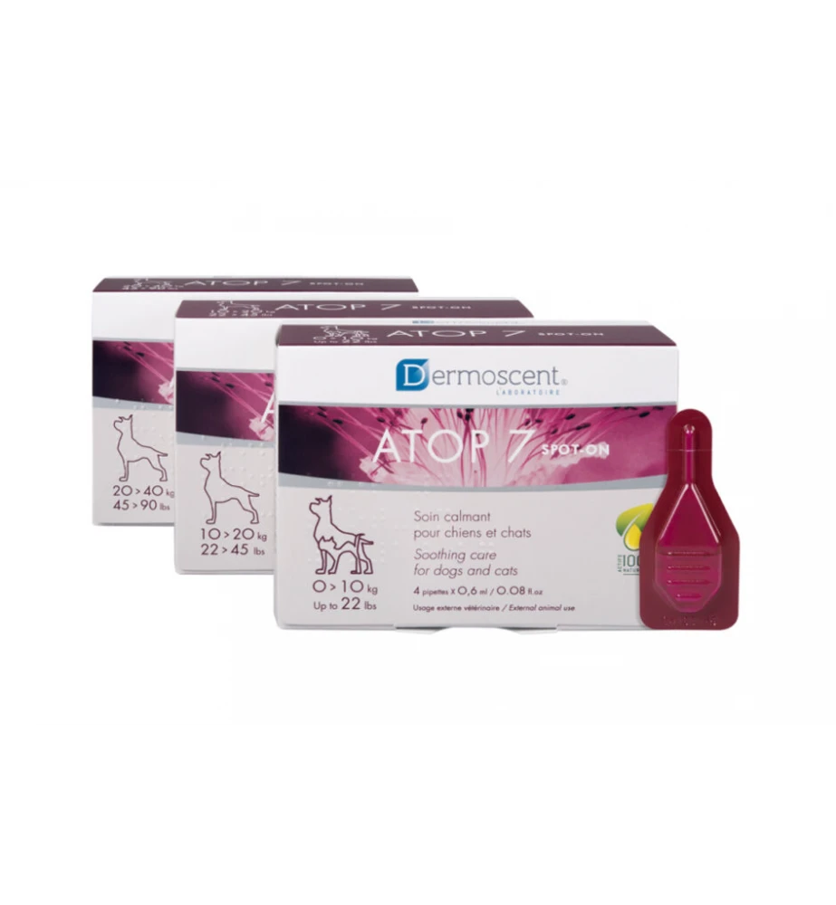Atop 7 Spot-On van Dermoscent is een spot-on vloeistof ter ondersteuning van de gevoelige huid en atopische dermatitis bij honden en katten. De Dermoscent Atop 7 Spot-on bevat etherische oliën, ceramiden en essentiële vetzuren en is rijk aan kurkuma, wintergroen en shiu hout voor een rustgevende werking.