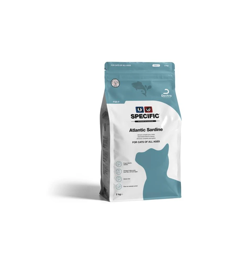Specific Atlantic Sardine FQD-F is een complete en gebalanceerde onderhoudsvoeding op basis van Atlantische Sardines (zonder tarwegluten) voor volwassen katten. Ook bevat deze voeding Krill en Algen als basis van Omega-3 vetzuren dat een positief effect heeft op vacht, huid en gewrichten.